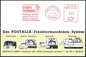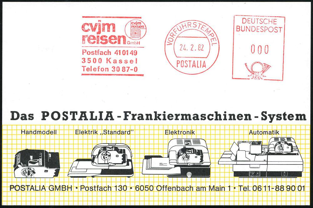 2451 | 18 € | 3500 Kassel Absender-Freistempel : 3500 Kassel 1962 (24.2.) AFS: VORFÜHRSTEMPEL/POSTALIA/c v j m/ reisen GmbH (Logo) seltene Postalia-Musterkt.! (= Specimen) | ![]() | |