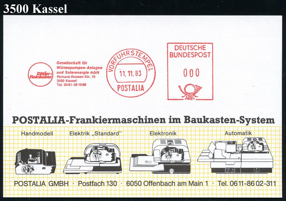 2452 | 18 € | 3500 Kassel Absender-Freistempel : 3500 Kassel 1983 (11.11.) AFS: VORFÜHRSTEMPEL/POSTALIA/Dittler +/Reinkober/Gesellschaft für/Wärmepumpen-Anlagen.. , seltene Postalia-Musterkt.! (= Specimen) | ![]() | |
