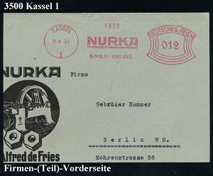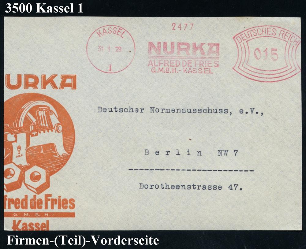 2365 | 25 € | 3500 Kassel Absender-Freistempel : KASSEL/ 1/ NURKA.. 1929/33 2 verschiedene AFS Francotyp "Bogenrechteck" der Fa. Alfred de Fries klar auf 2 Teil-Vorderseiten (Dü.E-1CAh) | ![]() ![]() ![]() | |