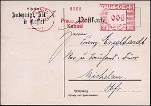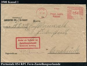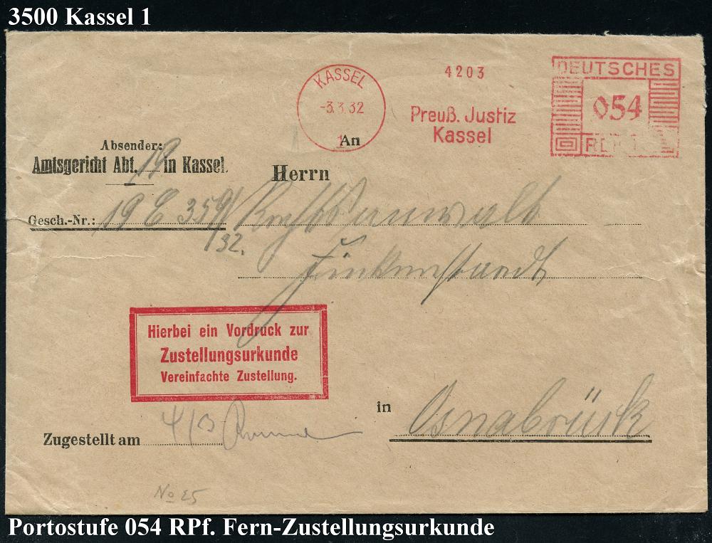 2368 | 25 € | 3500 Kassel Absender-Freistempel : KASSEL/ 1/ Preuß.Justiz/ Kassel 1932 (3.3.) AFS Francotyp "Mäanderrechteck" 054 Pf. auf Fern-Zustellungsurkunde (ZU) n. Osnabrück, seltene Portostufe! (Dü.E-2BAh) | ![]() ![]() ![]() | |