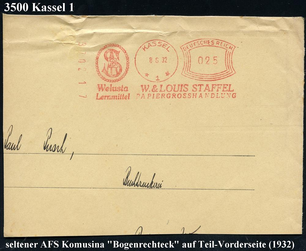 2369 | 18 € | 3500 Kassel Absender-Freistempel : KASSEL/ *1*/ Welusta/ Lehrmittel/ W.& LOUIS STAFFEL/ PAPIERGROSSHANDLUNG 1932 (8.6.) seltener AFS-Typ Komusina "Bogenrechteck" (Monogr.-Logo) Teil-Vorderseite (Dü.E-1 Ko) | ![]() | |