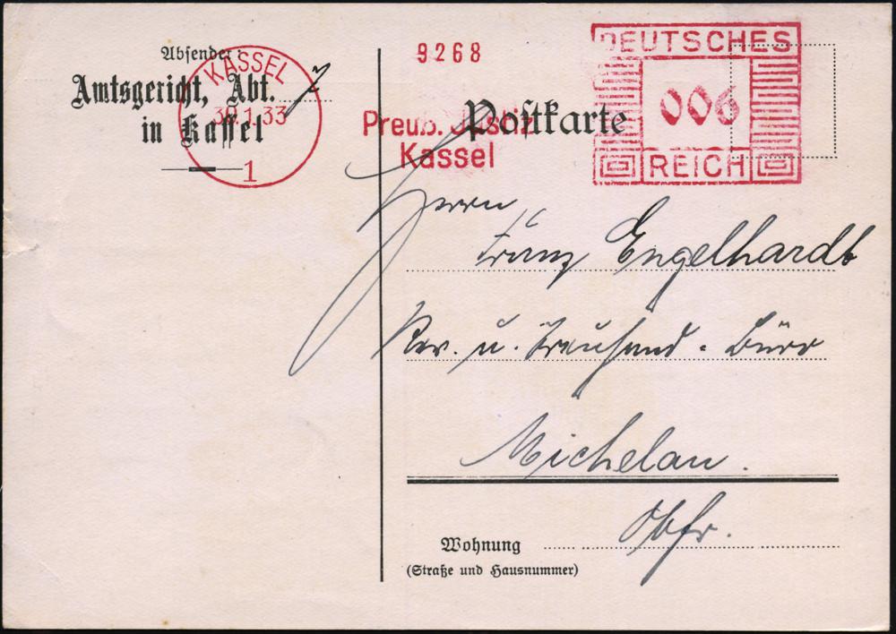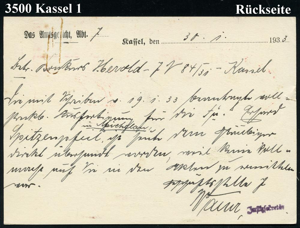 2370 | 30 € | 3500 Kassel Absender-Freistempel : KASSEL/ 1/ Preuß.Justiz/ Kassel 1933 (30.1.) AFS Francotyp "Mäanderrechteck" = T a g d e r M a c h t e r g r e i f u n g Hitlers! , Dienst-Kt.; Amtsgericht.. (kl. Rißchen, rs. Rostfleckchen) seltenes Zeit-Datum! (Dü.E-2BAh) | ![]() ![]() ![]() | |
