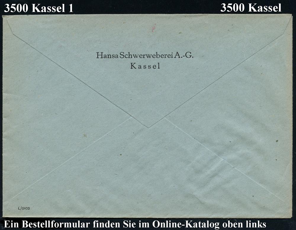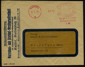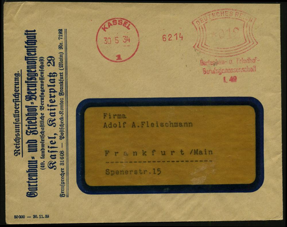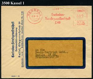 2374 | 18 € | 3500 Kassel Absender-Freistempel : KASSEL/ 1/ Gartenbau- u. Friedhof-/ Berufsgenossenschaft/ L49 1934 (30.5.) AFS Francotyp "Bogenrechteck" auf dekorativem Firmen-Bf.: Gartenbau- u. Friedhof=Berufsgenossenschaft (Dü.E-1Am) | ![]() | |