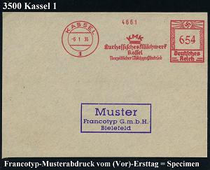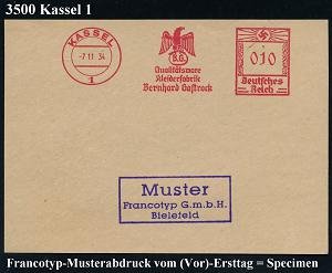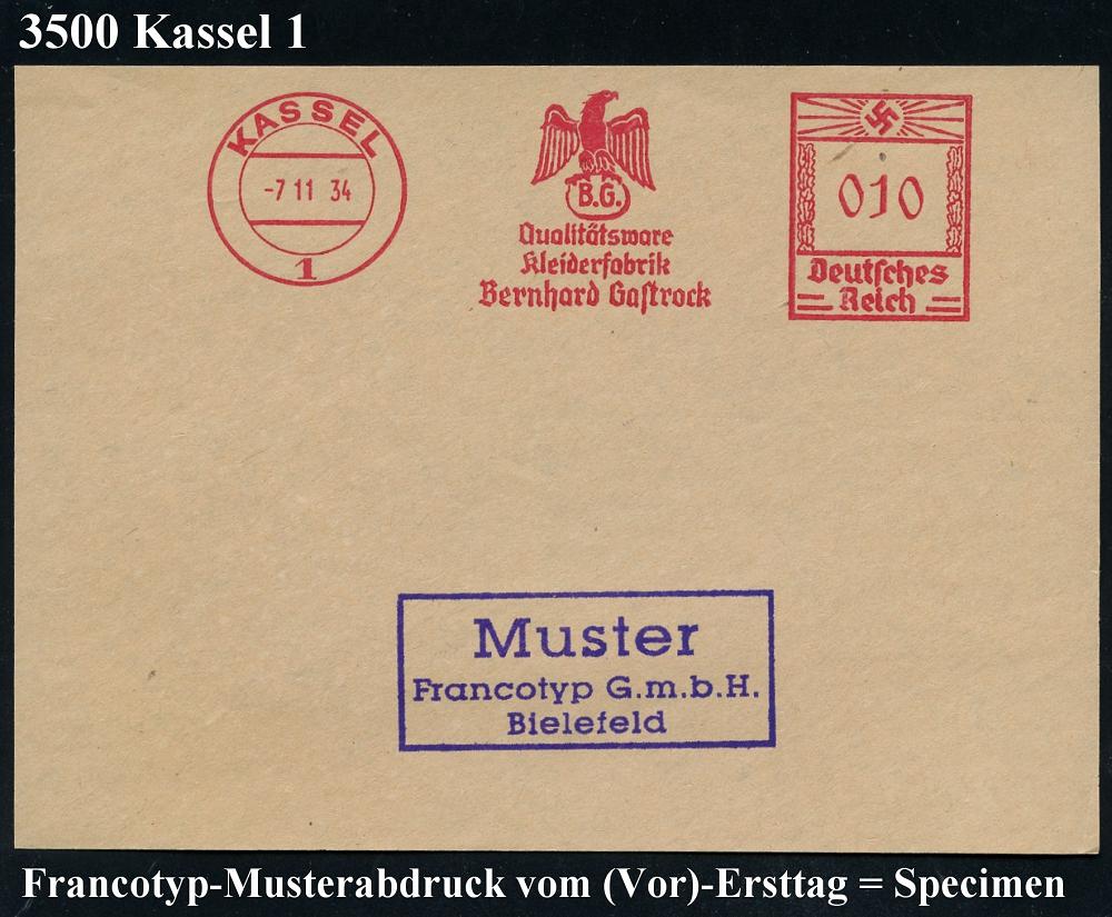 2375 | 35 € | 3500 Kassel Absender-Freistempel : KASSEL/ 1/ B.G./ ..Kleiderfabrik/ Bernhard Gastrock 1934 (7.11.) AFS-Musterabdruck Francotyp "Hakenkreuz" (Firmen-Logo) glasklar gest. Francotyp-Musterblatt vom (Vor)-Ersttag!, selten! (Dü.E-3CEo) | ![]() ![]() | |