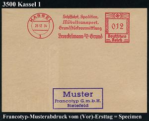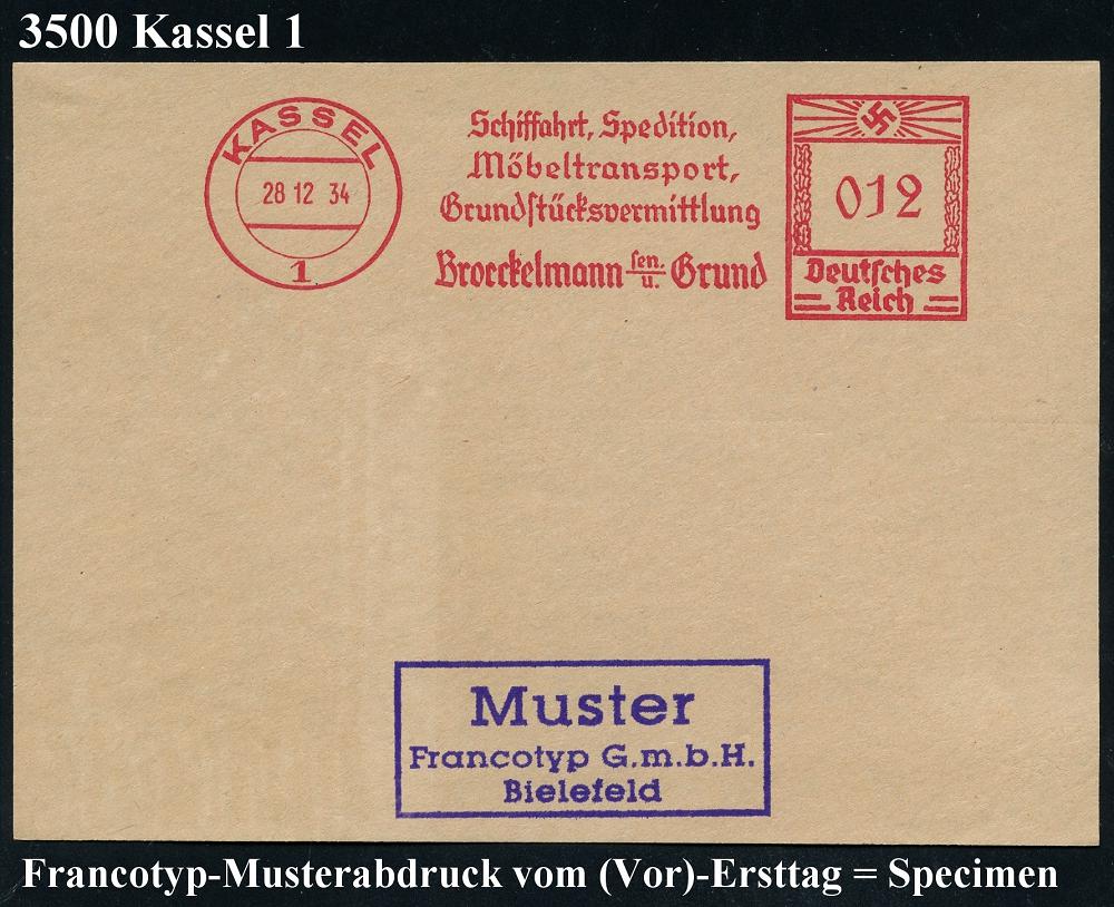 2377 | 35 € | 3500 Kassel Absender-Freistempel : KASSEL/ 1/ Schiffahrt,Spedition/ Möbeltransport../ Broeckelmann sen./ u. Grund 1934 (28.12.) AFS-Musterabdruck Francotyp "Hakenkreuz" , glasklar gest. Francotyp-Musterblatt vom (Vor)-Ersttag!, selten! (Dü.E-3CEo) | ![]() ![]() | |