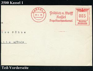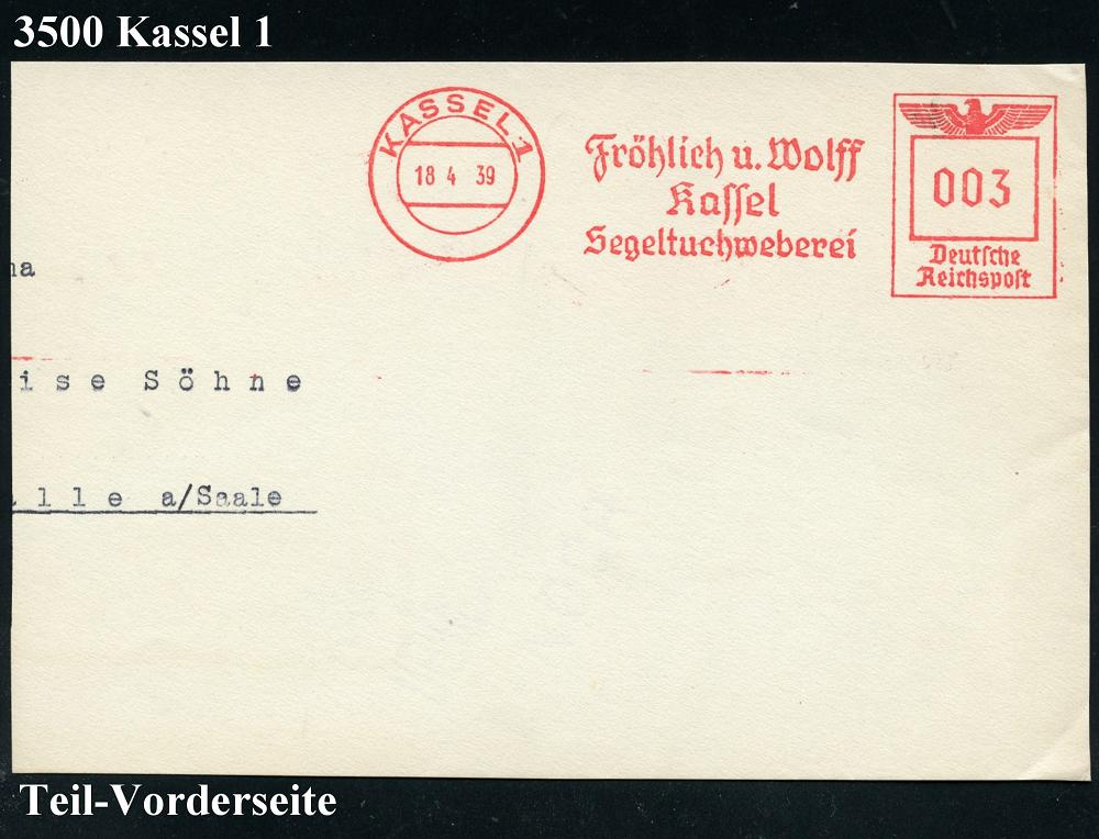 2398 | 15 € | 3500 Kassel Absender-Freistempel : KASSEL 1/ Fröhlich u.Wolff/ ..Segeltuchweberei 1939 (18.4.) AFS Francotyp "Reichsadler" klar gest. Teil-Vorderseite (Dü.E-5CEo) | ![]() | |