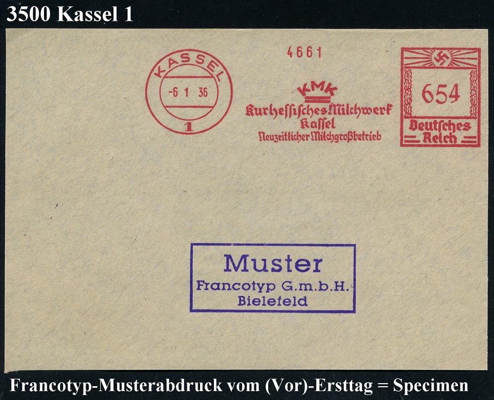 2384 | 35 € | 3500 Kassel Absender-Freistempel : KASSEL/ 1/ KMK/ Kurhess.Milchwerk.. 1936 (5.1.) AFS-Musterabdruck Francotyp "Hakenkreuz" (Monogr.-Logo) glasklar gest. Francotyp-Musterblatt vom (Vor)-Ersttag!, selten! (Dü.E-3CEh) | ![]() ![]() | |