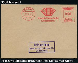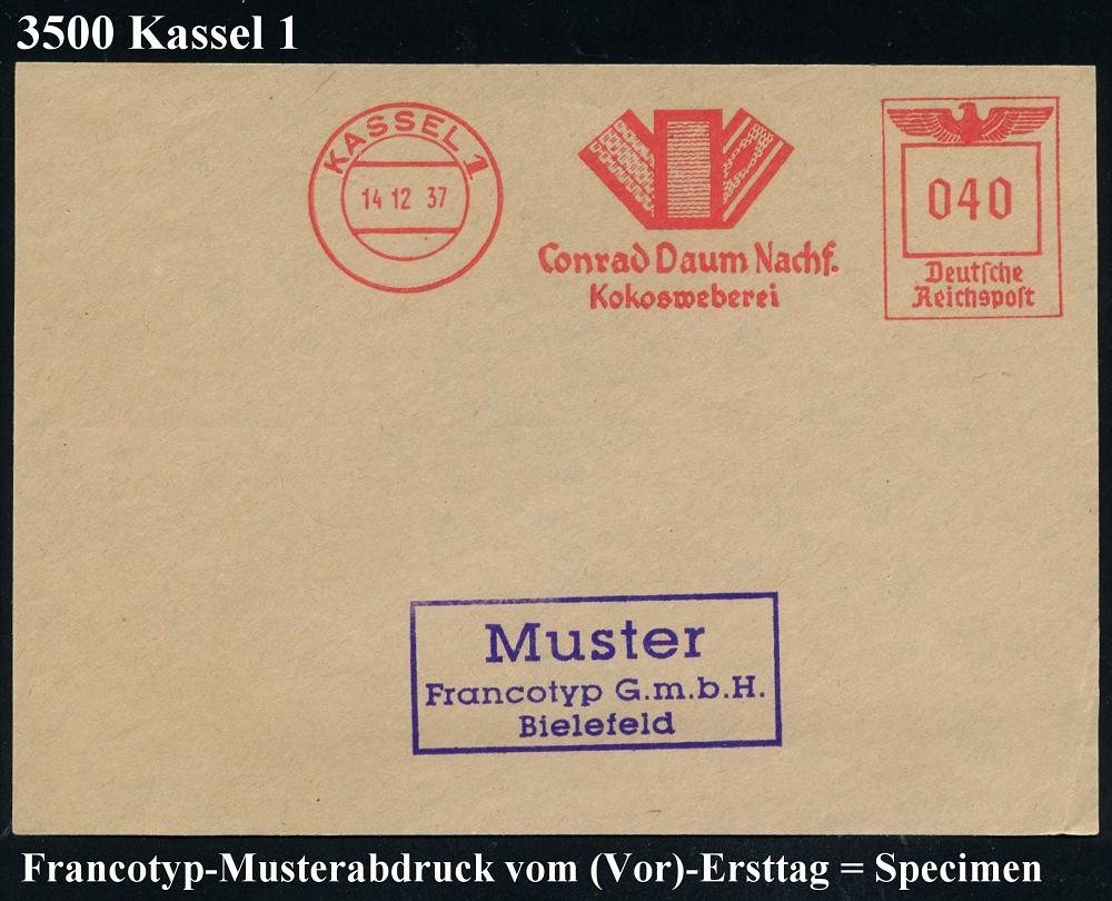 2389 | 35 € | 3500 Kassel Absender-Freistempel : KASSEL 1/ Conrad Dau Nachf./ Kokosweberei 1937 (14.12.) AFS-Musterabdruck Francotyp "Reichsadler" (3 Kokos-Matten) glasklar gest. Francotyp-Musterblatt vom (Vor)-Ersttag!, selten! (Dü.E-5CGo) | ![]() ![]() | |