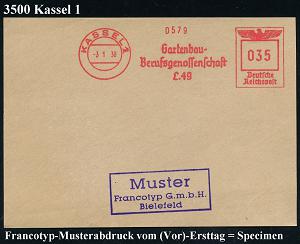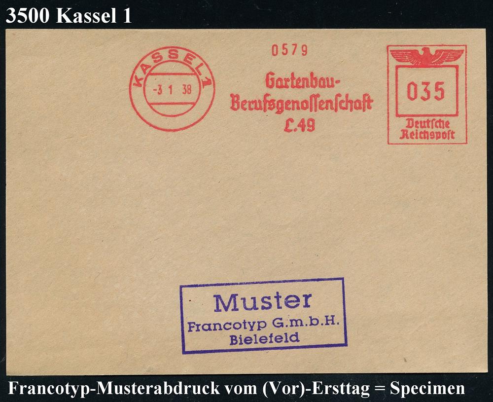 2390 | 35 € | 3500 Kassel Absender-Freistempel : KASSEL 1/ Gartenbau-/ Berufsgenossenschaft/ L.49 1938 (3.1.) AFS-Musterabdruck Francotyp "Reichsadler" , glasklar gest. Francotyp-Musterblatt vom (Vor)-Ersttag!, selten! (Dü.E-5CGh) | ![]() ![]() | |