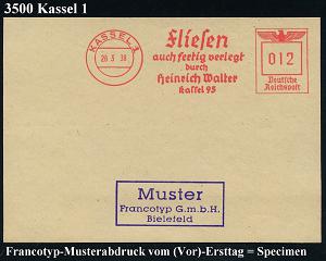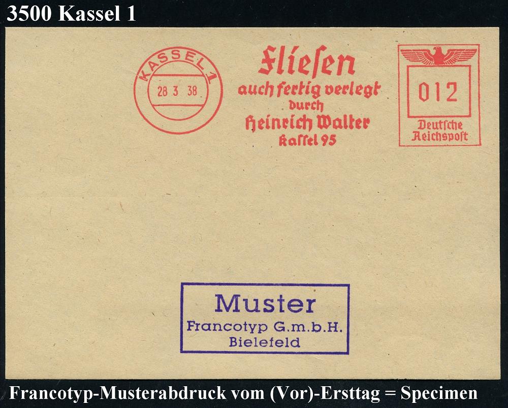 2393 | 35 € | 3500 Kassel Absender-Freistempel : KASSEL 1/ Fliesen/ auch fertig verlegt/ durch/ Heinrich Walter.. 1938 (28.3.) AFS-Musterabdruck Francotyp "Reichsadler" , glasklar gest. Francotyp-Musterblatt vom (Vor)-Ersttag!, selten! (Dü.E-5CGo) | ![]() ![]() | |