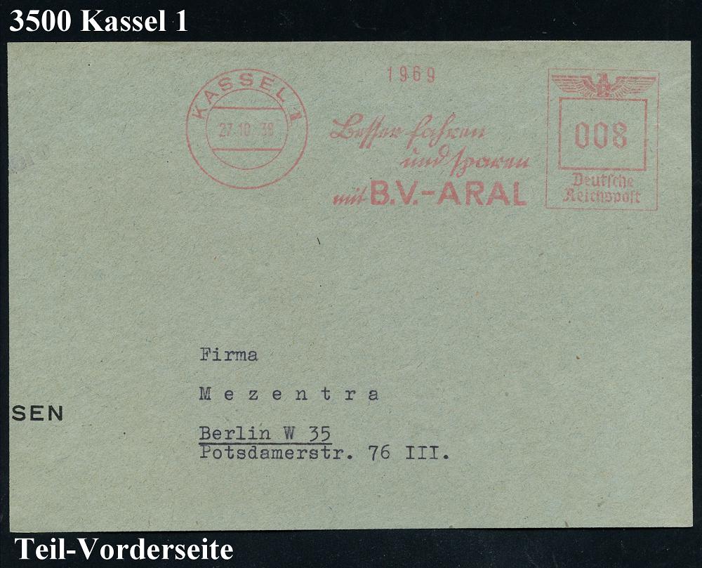 2397 | 15 € | 3500 Kassel Absender-Freistempel : KASSEL 1/ Besser fahren/ u.sparen/ mit B.V.-ARAL 1938 (25.10.) AFS Francotyp "Reichsadler" , Text teils Sütterlin, Teil-Vorderseite (Dü.E-5CGh) | ![]() | |