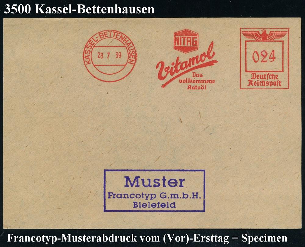 2399 | 35 € | 3500 Kassel Absender-Freistempel : KASSEL-BETTENHAUSEN/ NITAG/ Vitamol/ Das/ vollkommene/ Autoöl 1939 (28.7.) AFS-Musterabdruck Francotyp "Reichsadler" (Firmen-Logo) glasklar gest. Francotyp-Musterblatt vom (Vor)-Ersttag!, selten! (Dü.E-5CEo) | ![]() ![]() | |