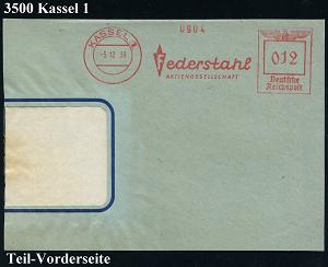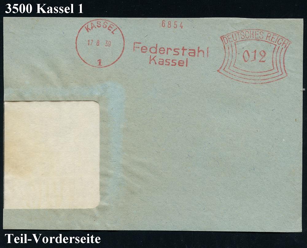 2400 | 20 € | 3500 Kassel Absender-Freistempel : KASSEL/ 1/ Federstahl.. 1939 AFS Francotyp "Bogenrechteck" bzw. "Reichsadler" (1x Firmen-Logo) 2 Bedarfs-Teil-Vorderseiten (Dü.E-1CEh, E-5CEh) | ![]() ![]() | |
