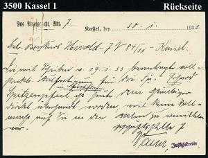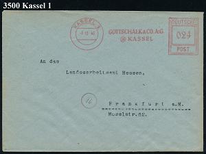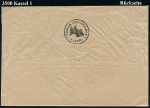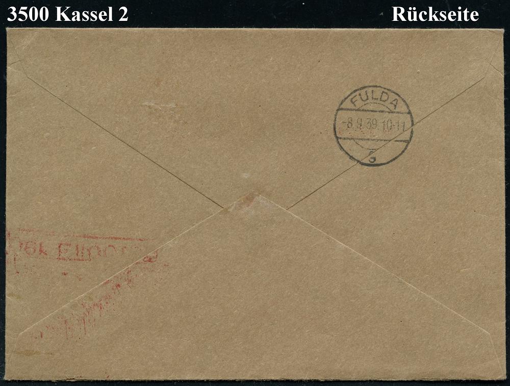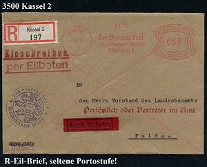 2401 | 40 € | 3500 Kassel Absender-Freistempel : KASSEL/ 1/ Der Oberpräsident/ (Bezirksverband Hessen)/ Ständeplatz 8 1939 (7.7.) AFS Francotyp "Bogenrechteck" 082 Pf. + RZ: Kassel 2 viol. Dienstsiegel-HdN: DER OBERPRÄSIDENT.. (hess. Wappenlöwe) Fern-Eil-R-Bf. n. Fulda, rs. AS., sehr seltene Portostufe! (Dü.E-1CEh) | ![]() ![]() | |