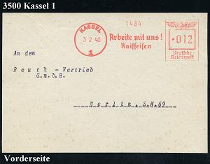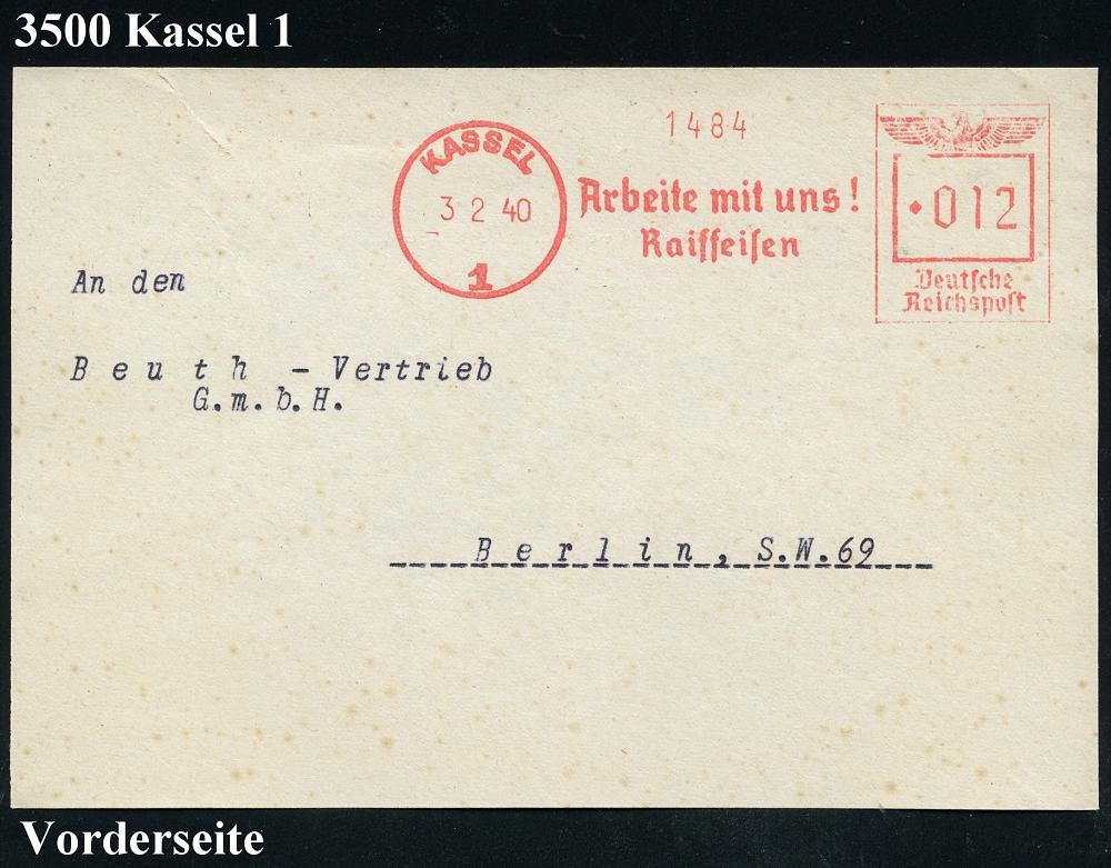2403 | 15 € | 3500 Kassel Absender-Freistempel : KASSEL/ 1/ Arbeite mit uns!/ Raiffeisen 1940 (3.2.) AFS Francotyp "Reichsadler" , kleine Bedarfs-Vorderseite (Dü.E-5DGh) | ![]() | |