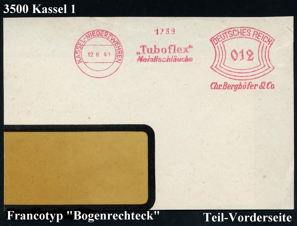 2404 | 14 € | 3500 Kassel Absender-Freistempel : KASSEL-NIEDERZWEHREN/ "Tuboflex"/ Metallschläuche/ Chr.Berghöfer & Co 1940 (12.6.) AFS Francotyp "Bogenrechteck" klar auf Teil-Vorderseite (Dü.E-1CAh) | ![]() | |
