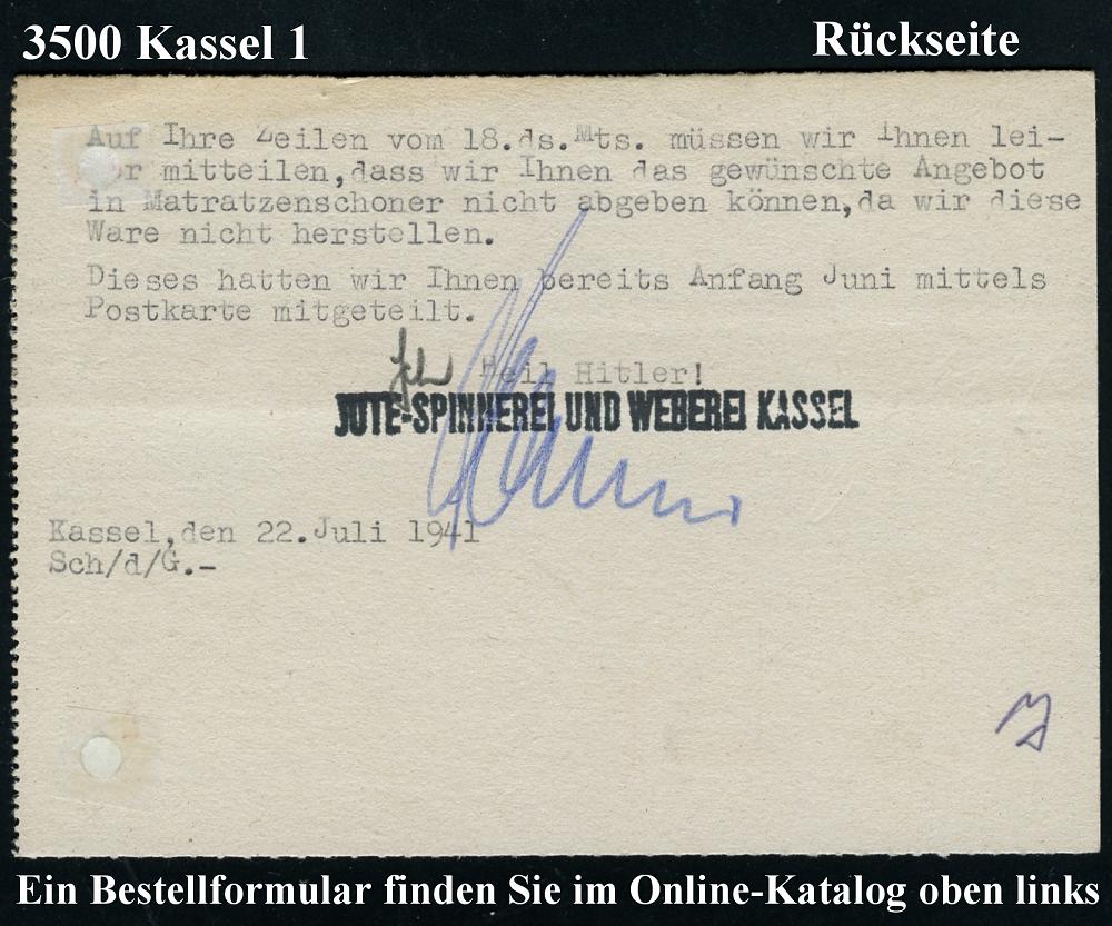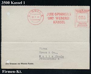 2407 | 16 € | 3500 Kassel Absender-Freistempel : KASSEL 1/ JUTE-SPINNEREI/ UND WEBEREI/ KASSEL 1941 (22.7.) AFS Francotyp "Reichsadler" auf Firmen-Kt. (Reg.-Lochung geschl.) rs. viol. 1L: JUTE-SPINNEREI U. WEBEREI KASSEL, vergl. Nr.2387 (Dü.E-5CGo) | ![]() ![]() | |