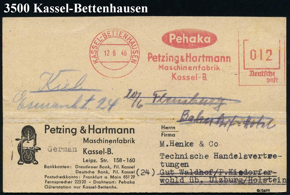 2411 | 25 € | 3500 Kassel Absender-Freistempel : KASSEL-BETTENHAUSEN/ Pehaka/ Petzing & Hartmann/ Maschinenfabrik 1946 (12.6.) aptierter AFS Francotyp "Reichsadler" = entfernt + "Reichs" = Notmaßnahme! , illustrierte Firmen-Kt. (Maschine) nachgesandt n. Kiel (Dü.E-13 Y-129o) | ![]() | |