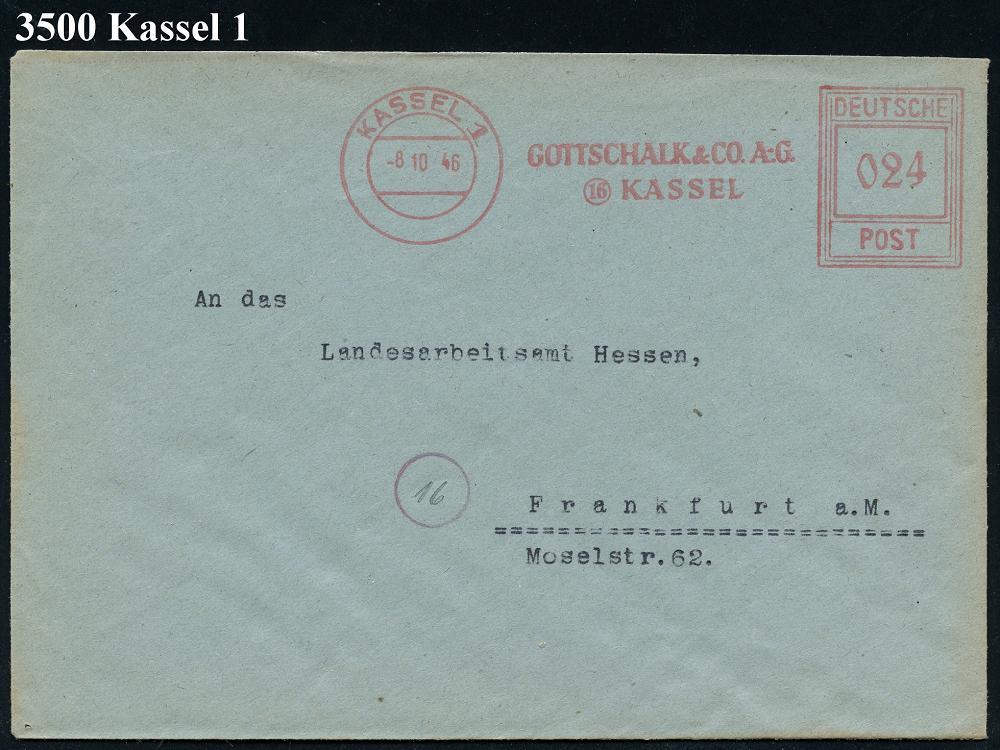 2414 | 20 € | 3500 Kassel Absender-Freistempel : KASSEL 1/ GOTTSCHALK & CO. A-G./ (16) KASSEL 1946 (6.10.) seltener AFS-Typ Francotyp "Hochrechteck" , rs. Abs.-Vordruck: Hansa Schwerweberei A.G., Fern-Bf. (Dü.E-18CEo, nur ca. 1 1/2 Jahre verwendet!) | ![]() ![]() | |