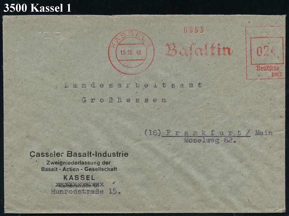 2415 | 22 € | 3500 Kassel Absender-Freistempel : KASSEL 1/ Basaltin 1946 (15.10.) aptierter AFS Francotyp "Reichsadler" = entfernt + "Reichs" = Notmaßnahme! , Firmen-Bf.: Casseler Basalt-Industrie.. n. Ffm. (Dü.E-13 Y-129h) | ![]() | |