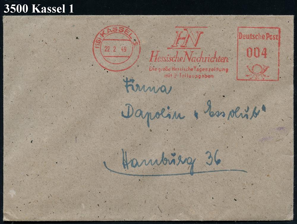 2423 | 14 € | 3500 Kassel Absender-Freistempel : (16) KASSEL 1/ HN/ Hessische Nachrichten/ Die große hess.Tageszeitung.. 1949 (22.2.) AFS Francotyp "Posthorn - Deutsche Post" (Monogr.-Logo) Fern-Bf. (Dü.E-20CGo mit A-Rahmen!) | ![]() | |