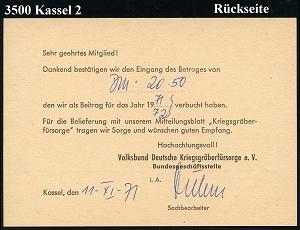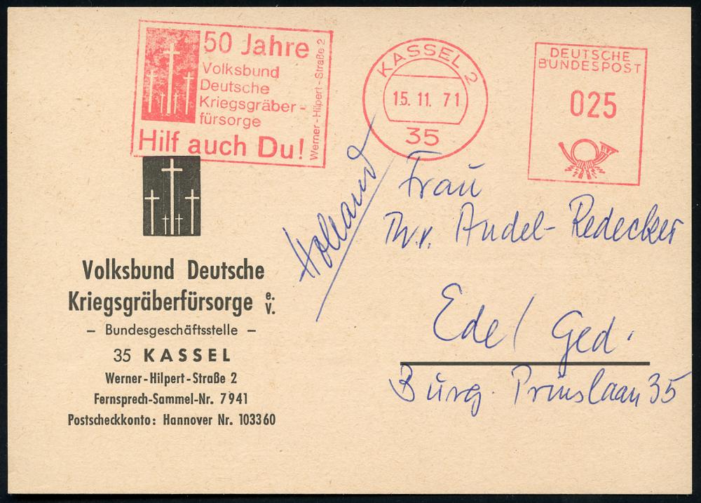 2445 | 16 € | 3500 Kassel Absender-Freistempel : 35 KASSEL 2/ 50 Jahre/ Volksbund/ Deutsche/ Kriegsgräber-/ fürsorge.. 1971 (15.11.) seltener Jubil.-AFS Francotyp (5 Kreuze) = Betreuung der Kriegsgräber des II. Wk., motivgl. Ausl.-Spendendank-Kt.! (Dü.E-26) | ![]() ![]() | |