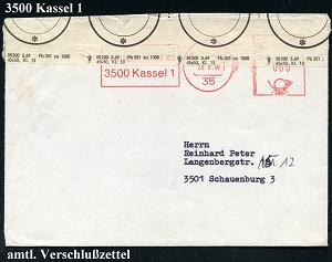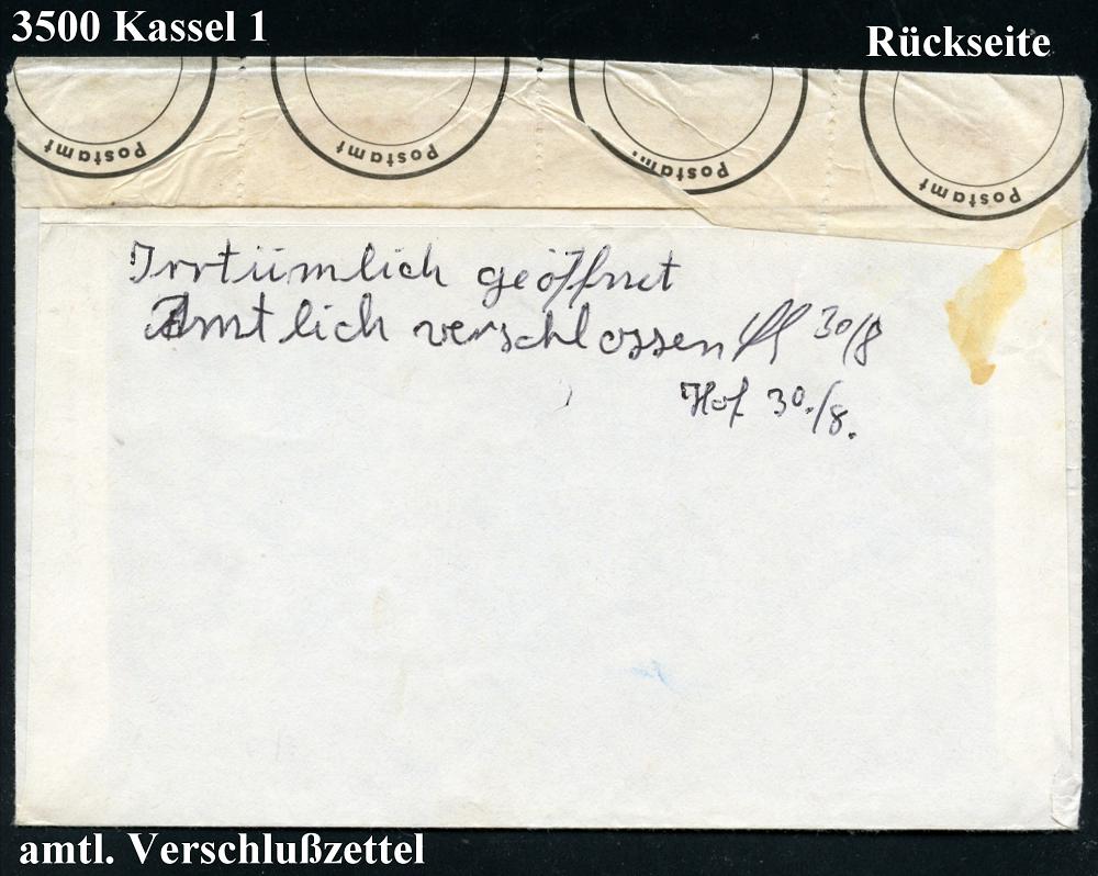2448 | 18 € | 3500 Kassel Absender-Freistempel : 35 KASSEL 1/ Postfach 10 07 49/ 3500 Kassel 1 1980 (28.8.) anonymer AFS Postalia + neutaler Klebezettel: Postamt/* als 4er-Streifen + hs. Vermerk "Jrrtümlich geöffnet, Amtlich verschlossen..Hof ,30.8." , postamtl. behandelter Fern-Bf. n. 3501 Schauenburg 3, Unikat! (Dü.E-26B) | ![]() ![]() | |