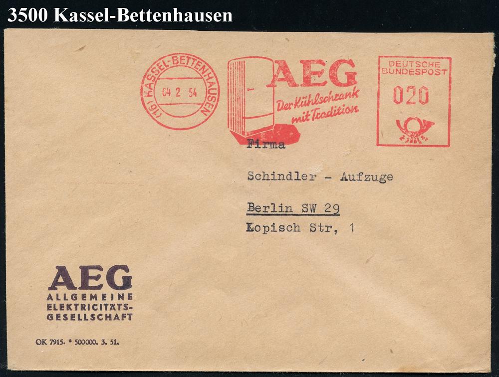 2429 | 12 € | 3500 Kassel Absender-Freistempel : (16) KASSEL-BETTENHAUSEN/ AEG/ Der Kühlschrank/ mit Tradition 1954 (4.2.) AFS Francotyp "Posthorn" (Kühlschrank) auf Firmen-Bf.: AEG.. (Dü.E-23CG) | ![]() | |