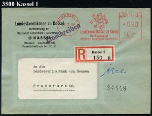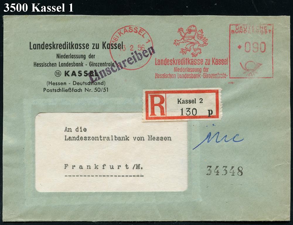2431 | 18 € | 3500 Kassel Absender-Freistempel : (16) KASSEL 1/ Landeskreditkasse zu Kassel.. 1956 (13.2.) AFS Francotyp "Posthorn" 090 Pf. (hess. Wappenlöwe) + alter RZ: Kassel 2/p, klar gest. Fern-R-Bf. (Dü.E-23DO mit Raute) | ![]() | |