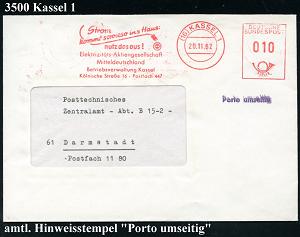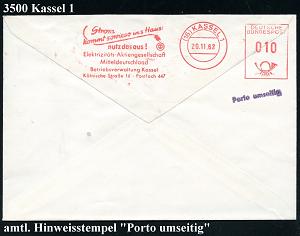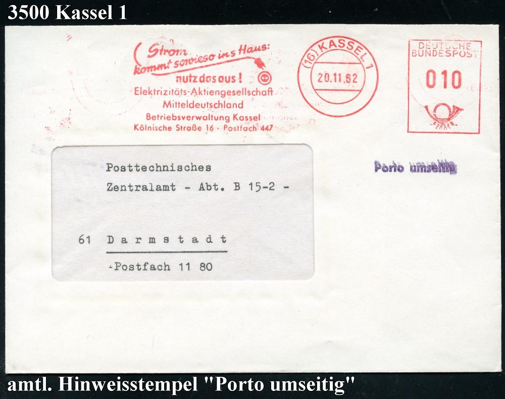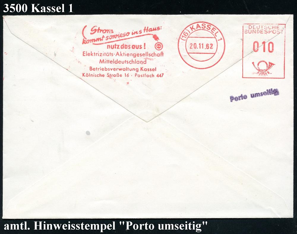 2435 | 25 € | 3500 Kassel Absender-Freistempel : (16) KASSEL 1/ Strom/ kommt sowieso ins Haus/ nutz das aus!/ Elektrizitäts-AG/ Mitteldeutschland.. 1962 (20.11.) AFS Francotyp "Posthorn" mit alter PLZ 10 Pf. + 10 Pf., 1x rs. (Kabel mit Stecker, Steckdose) + amtl. viol. 1L: Porto umseitig, da Teilporto rückseitig angebracht, ungewöhnl. Fern-Bf. (Dü.E-26, alte PLZ) | ![]() ![]() | |