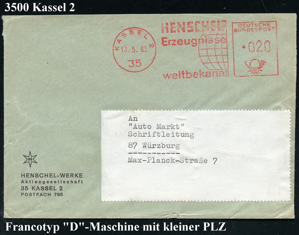 2436 | 20 € | 3500 Kassel Absender-Freistempel : 35 KASSEL 2/ HENSCHEL/ Erzeugnisse/ weltbekannt 1963 (13.5.) AFS Francotyp "D"-Maschine mit kleinem Orts-1K mit neuer PLZ (Globus) Firmen-Bf.: HENSCHEL-WERKE AG.. = Hersteller von Lokomotiven, LKW etc. (Dü.E-23DO + kl. PLZ + Raute) | ![]() | |