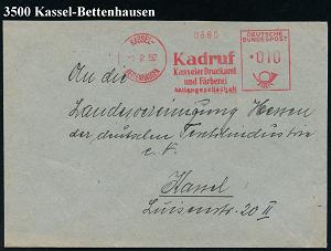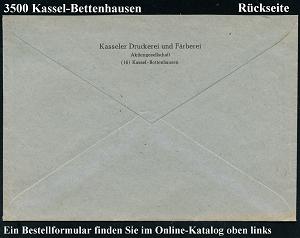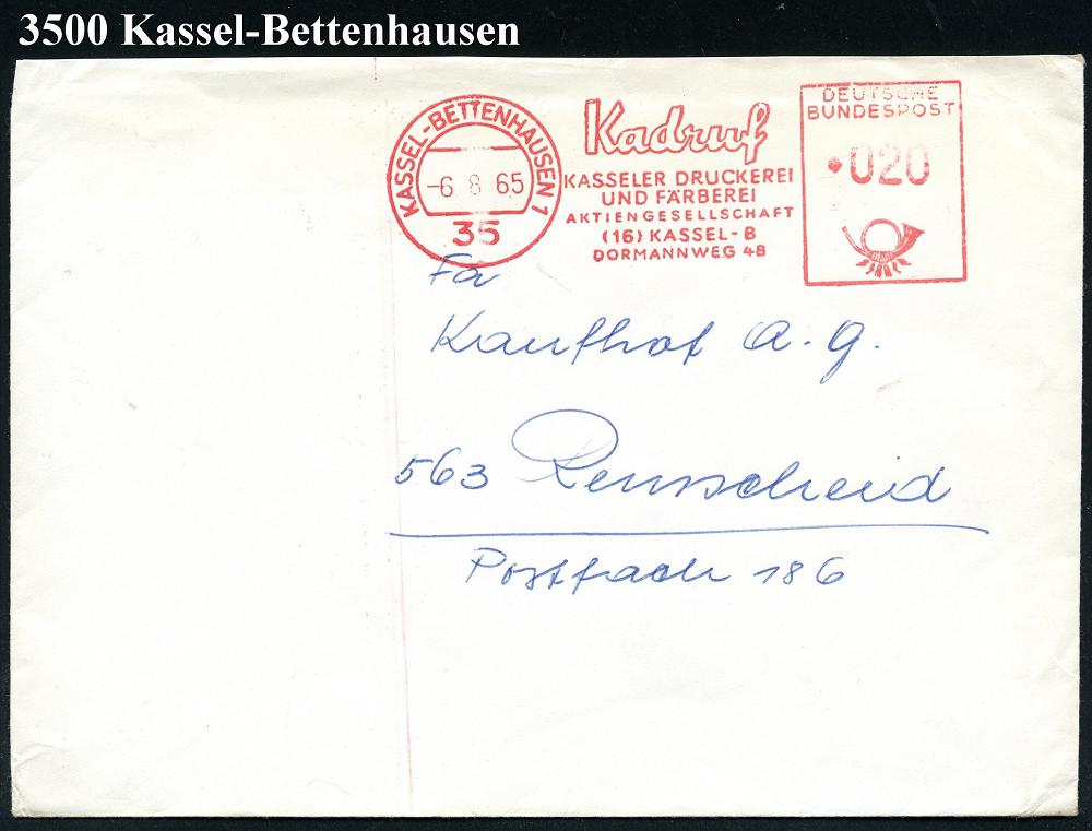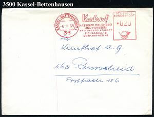 2440 | 16 € | 3500 Kassel Absender-Freistempel : 35 KASSEL-BETTENHAUSEN 1/ Kadruf/ KASSELER DRUCKEREI/ U.FÄRBEREI AG.. 1965 (6.8.) AFS Francotyp "Posthorn", seltene "A"-Maschine , Fern-Bf. (Dü.E-23 AO mit Raute = seltene Type!) | ![]() | |