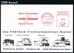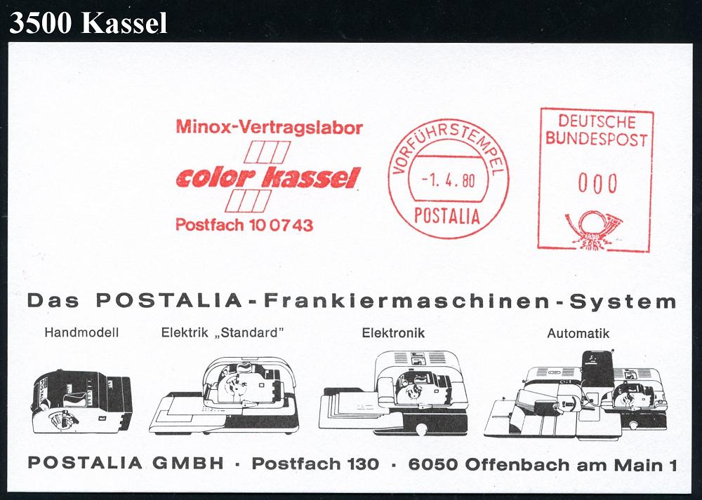2447 | 18 € | 3500 Kassel Absender-Freistempel : Kassel 1980 (1.4.) AFS.: VORFÜHRSTEMPEL/POSTALIA/Minox-Vertragslabor/color kassel.. (Logo) seltene Postalia-Muster-Kt.! (= Specimen) | ![]() | |