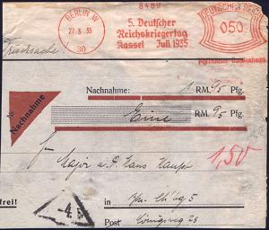 2362 | 45 € | 3500 Kassel Absender-Freistempel : BERLIN W/ 30/ 5.Deutscher/ Reichskriegertag/ Kassel Juni 1935/ Kyffhäuser Bundeshaus 1935 (27.3.) seltener AFS Francotyp "Bogenrechteck" 050 Pf. = sehr seltene Portostufe!, klar gest.Inl.-NN-Aufkleber (kl. Randmäng. u. Eckfehler) klar gest.!, der 5. Reichskriegertag sollte 1934 stattfinden, fiel aber wegen des "Röhm-Putsches" (Liquidierung der SA-Führer durch die SS,aus) , vergl. Nr.2363 (Dü.E-1CEh, nur kurze Verwendungszeit!) | ![]() | |