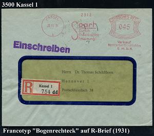 2367 | 25 € | 3500 Kassel Absender-Freistempel : KASSEL/ 1/ Spart/ durch/ Braunkohlen-/ Feuerung!/ Verkauf/ Hess.Braunkohlen/ GmbH 1931 (30.11.) AFS Francotyp "Bogenrechteck" 045 Pf. + RZ: Kassel 1/d d (= Selbstbucher) Inl.-R-Bf. (Dü.E-1CEh) | ![]() ![]() | |