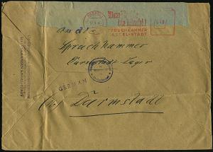 2418 | 28 € | 3500 Kassel Absender-Freistempel : KASSEL 1/ Dem Volke/ die Macht!/ SPRUCHKAMMER/ KASSEL-STADT 1947 (12.4.) sehr seltener, aptierter AFS Postalia "NS-Adler" = entfernt 048 Pf. = 3. Gew. Stufe (teils gering undeutl.) = Entnazifizierungs-Kammer, viol.Abs.-3L: Großhess. Staatsministerium/Der Minister für Wiederaufbau u. politische Befreiung.. (Bf. 2x gefaltet, Riß) Fernbf. an das Lager für NS-Belastete, Darmstadt! (Dü.E-15 C) | ![]() | |