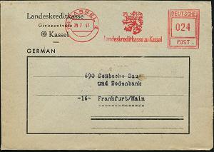 2420 | 20 € | 3500 Kassel Absender-Freistempel : (16) KASSEL 1/ Landeskreditkasse.. 1947 (26.7.) seltener AFS-Typ Francotyp "Hochrechteck" (hess. Wappenlöwe) klar gest. Dienst-Bf.: Landeskreditkasse, Girozentrale.. n. Ffm. (Dü.E-18CGo, nur ca 1 1/2 Jahre verwendet!) | ![]() | |