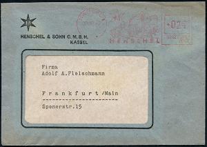 2421 | 35 € | 3500 Kassel Absender-Freistempel : KASSEL 1/ HENSCHEL 1947 (30.10.) seltener, aptierter AFS Francotyp "Reichsadler ANTIQUA" = entfernt + "REICHS" = Notmaßnahme! (Motiv: Dampflok), Firmen-Bf.: HENSCHEL & SOHN GMBH.. (rs. Klappenriß), Fern-Bf. (Dü.E-14K-231o = Spätverwendung!) | ![]() | |