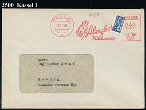 2428 | 12 € | 3500 Kassel Absender-Freistempel : KASSEL / 1/ Almglocke/ Milchwerke 1953 (10.11.) AFS Francotyp "Posthorn" ohne PLZ = Milchflasche mit 2 Glocken auf 2 Pf. NoB (= VE), klar gest. Inl.-Bf. (Dü.E-23CEh) | ![]() | |