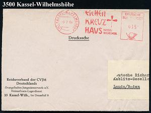 2438 | 18 € | 3500 Kassel Absender-Freistempel : (16) KASSEL-WILHELMSHÖHE/ EICHEN/ KREUZ/ HAUS 1964 (9.7.) AFS Postalia "Posthorn" = CVJM (Eichenblätter) auf (etw. verkürztem) seltenem Vordruch-Bf.: Reichsverband der CVJM Deutschlands.. (Dü.E-23Po) | ![]() | |