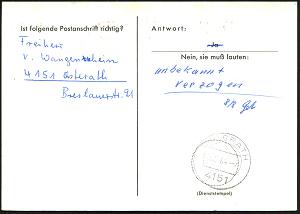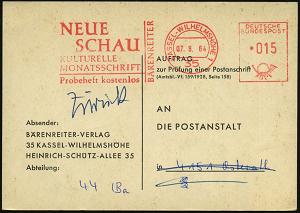 2439 | 35 € | 3500 Kassel Absender-Freistempel : 35 KASSEL-WILHELMSHÖHE/ MUSICA/ ALLG./ MUSIKZEITSCHRIFT/ BÄRENREITER.. 1964 (7.8.) AFS Francotyp "Posthorn" 015 Pf. auf Firmen-Retour-Kt.: AUFTRAG zur Prüfung einer Postanschrift mit Amtsblatt-Hinweis, rs. 1K: 4151 OSTERATH/c. seltene Portostufe u. Verwendung! (Götz,+ 500.-DM, 1980) | ![]() ![]() | |