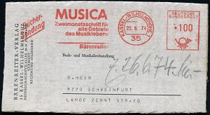 2446 | 18 € | 3500 Kassel Absender-Freistempel : 35 KASSEL-WILHELMSHÖHE 1/ MUSICA/ Zweimonatsschrift../ Bärenreiter 1974 (25.6.) AFS 100 Pf. + Zusatz "Bücher-Sendung" auf Verpackungs-Adreßträger, seltene Portostufe! (Dü.E-26) | ![]() | |
