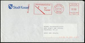 2453 | 12 € | 3500 Kassel Absender-Freistempel : 3500 KASSEL 1/ B66 3989/ Himmelsstürmer/ für Kassel 1992 (30.11.) AFS Postalia mit Kennung = Skulptur "Himmels-Stürmer" (von Jonathan Borofsky, prominenste Skulptur der Documenta IX, heue am Hauptbahnhof, Kommunal-Bf. (Dü.E-26B) | ![]() | |