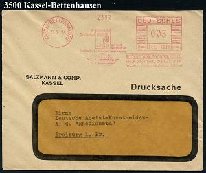 2373 | 25 € | 3500 Kassel Absender-Freistempel : KASSEL-BETTENHAUSEN/ ..Salzmann & Comp/ mech.Segeltuch-,Dreil- u.Leinen/ Weberei, Jmpr. Anstalten u.Färberei 1934 (28.2.) seltener AFS Francotyp "Mäanderrechteck" (Logo: "schwörende Hand" u.Auge) klar gest. Firmen-Bf. (Dü.E-2CEh) | ![]() | |