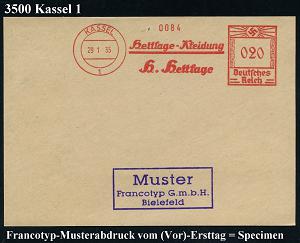 2378 | 35 € | 3500 Kassel Absender-Freistempel : KASSEL/ 1/ Hettlage-Kleidung/ H.Hettlage 1935 (29.1.) AFS-Musterabdruck Francotyp "Hakenkreuz" , glasklar gest. Francotyp-Musterblatt vom (Vor)-Ersttag!, selten! (Dü.E-3CEh) | ![]() ![]() | |