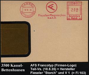2380 | 20 € | 3500 Kassel Absender-Freistempel : KASSEL-/ BETTENHAUSEN/ F/ Fieseler-Flugzeugbau GmbH 1935 (10.8.) seltener AFS Francotyp "Hakenkreuz" (Logo "F" im Kreis) klar gest. Teil-Vorderseite = Hersteller des Fieseler "Storch" = STOL-Flugzeug! (Dü.E-3CEo) | ![]() | |