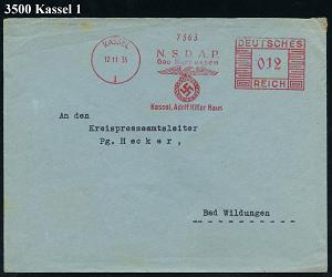 2383 | 20 € | 3500 Kassel Absender-Freistempel : KASSEL/ 1/ N.S.D.A.P./ Gau Kurhessen/ Kassel,Adolf Hitler Haus 1935 (12.11.) AFS Francotyp "Mäanderrechteck" (Hakenkreuz-Emblem) Fern-Bf. rs. nachträgl. Mitteilung (Dü.E-2CEh) | ![]() | |