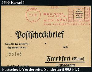 2385 | 18 € | 3500 Kassel Absender-Freistempel : KASSEL/ 1/ Besser fahren/ u.sparen/ mit B.V.-ARAL/ RAAB KARCHER-THYSSEN GMBH 1936 (11.5.) AFS Francotyp "Mäanderrechteck" 005 Pf. auf Postscheck-Vorderseite = seltenes Porto u. Verwendung! (Dü.E-2CEh) | ![]() | |