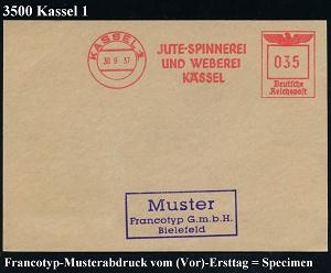 2387 | 35 € | 3500 Kassel Absender-Freistempel : KASSEL 1/ JUTE-SPINNEREI/ UND WEBEREI.. 1957 (30.9.) AFS-Musterabdruck Francotyp "Reichsadler" , glasklar gest. Francotyp-Musterblatt vom (Vor)-Ersttag!, selten! (Dü.E.5CGo) | ![]() ![]() | |