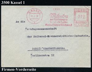 2391 | 16 € | 3500 Kassel Absender-Freistempel : KASSEL/ 1/ Milentra/ das Milcherzeugnis/ für fast alle Speisen/ Kurhess.Milchwerk 1938 (11.2.) AFS Francotyp "Hakenkreuz" auf kleiner Bedarfs-Vorderseite, vergl. Nr.2384 (Dü.E-3CEh) | ![]() | |